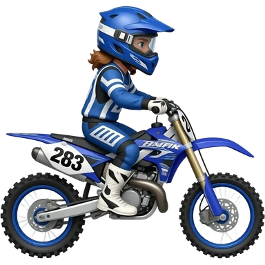 Guy on royal blue dirtbike with brown hair mullet and put 283 on the bike and make him have a helmet on emoji