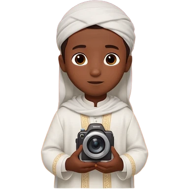 Personnage 3D mignon en style Pixar, un petit garçon portant un qamis blanc et un kufi, tenant un tapis de prière, entouré de lanternes brillantes, fond doux, couleurs chaudes, garçon teint noir TENANT UN APPAREIL PHOTO emoji