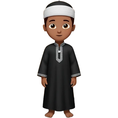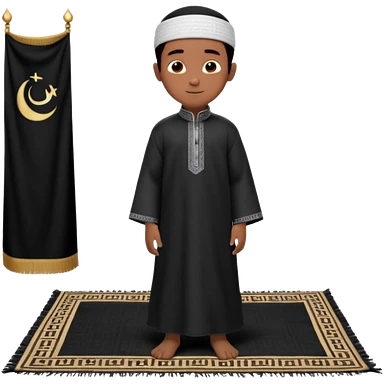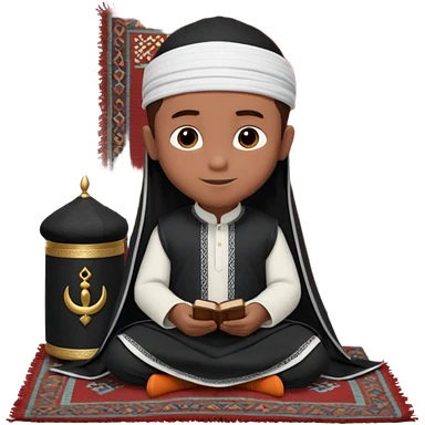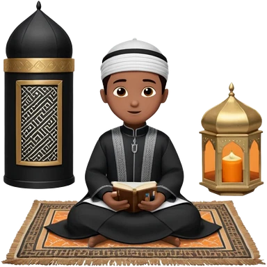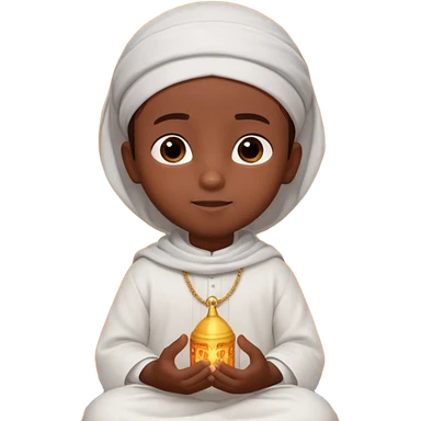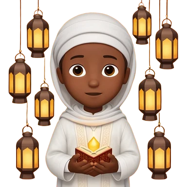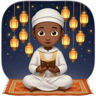 Personnage 3D mignon en style Pixar, un petit garçon portant un qamis blanc et un kufi, tenant un tapis de prière, entouré de lanternes brillantes, fond doux, couleurs chaudes, garçon teint noir emoji