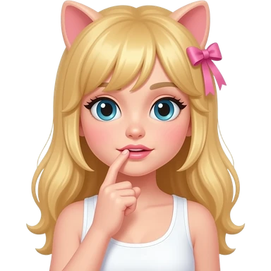 una chica con el pelo rubio y largo la camizeta de color blanco y un laso rosa el el pelo y que se muerda el dedo como katteyes si pero sin las orejas quitale las orejas emoji