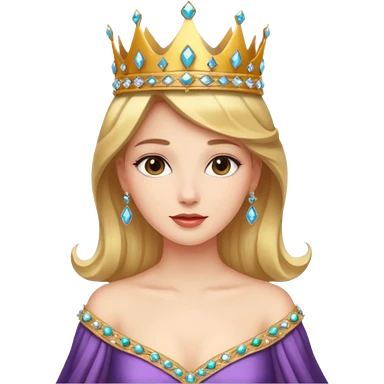 Queen, brown long hair, golden crown encrusted with pink and blue diamonds, black dress emoji