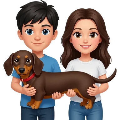 Quiero un perrito salchicha marrón con algún tono más claro en las paticas y alrededor de los ojitos y que una pareja lo tenga en brazos un muchacho de pelo negro y una muchacha de pelo oscuro emoji