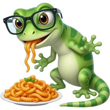 Quiero un diseño de gheco rockero comiendo pasta color naranja con gafas y muy rebelde è irreverente emoji
