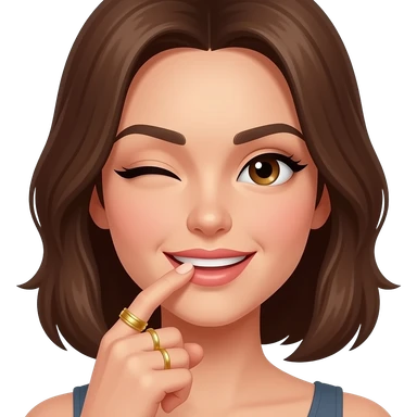 Quero que sea una mujer. En una orega tiene una argolla dorada y en la otra tiene la misma más otra más chica.quero q se este mordiendo la uña del dedo índice y este guiñando un ojo emoji