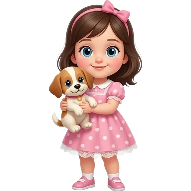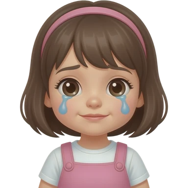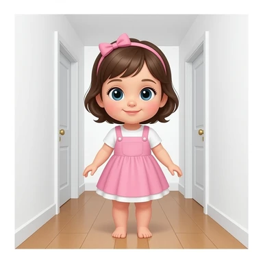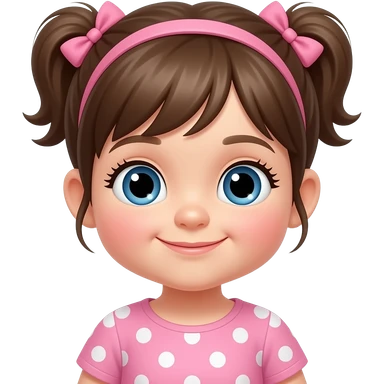 Una bebe niña con el palo castaño con dos coletas, vestido azul con margaritas emoji