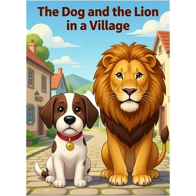 quiero una portada de comic que se titule the dog an the lion in a village emoji