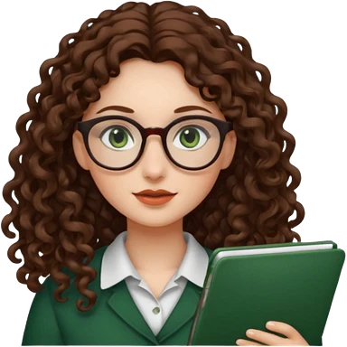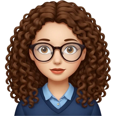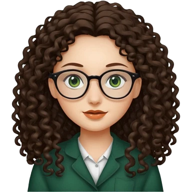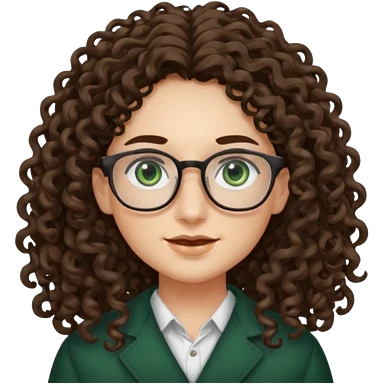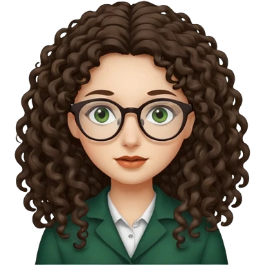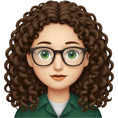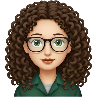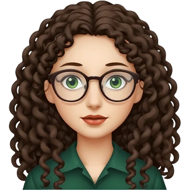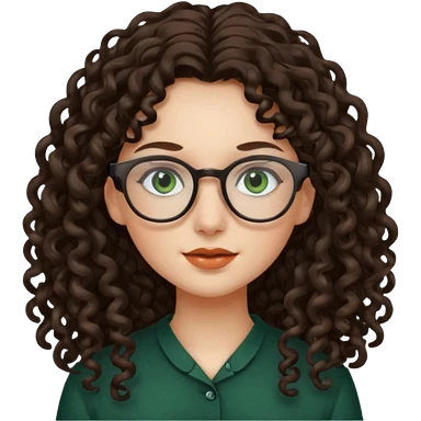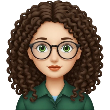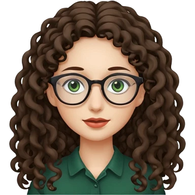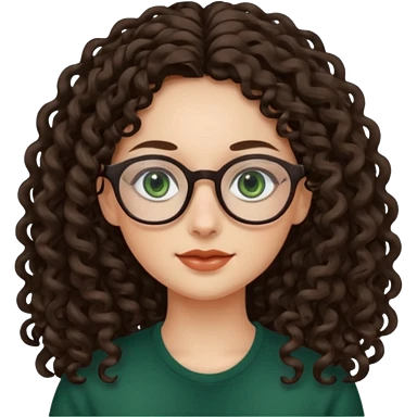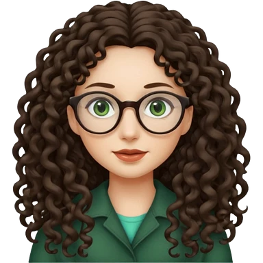 rapariga, olhos verdes escuros, rosto oval, cabelos muito compridos aos caracóis, com óculos emoji