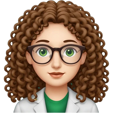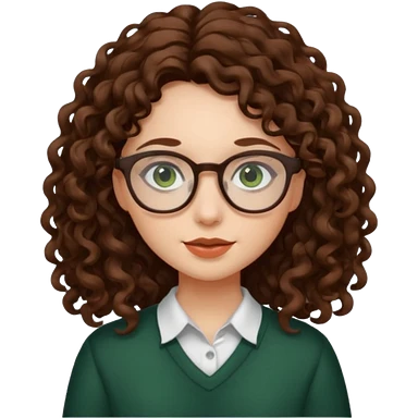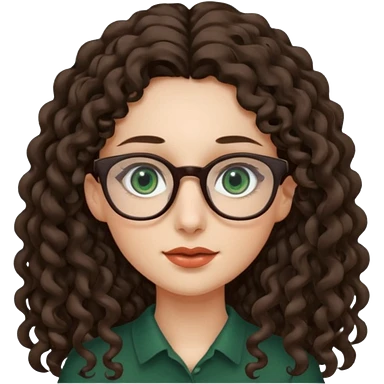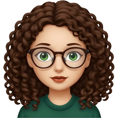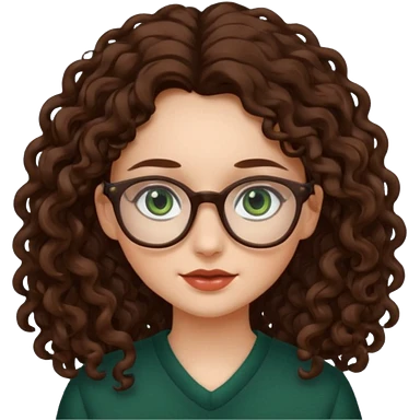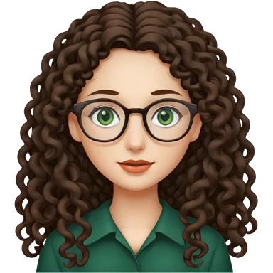 rapariga, olhos verdes escuros, cabelos compridos aos caracóis, com óculos emoji
