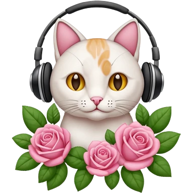 Ramo de flores rosas y junto a un gato con auriculares emoji