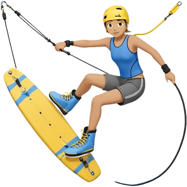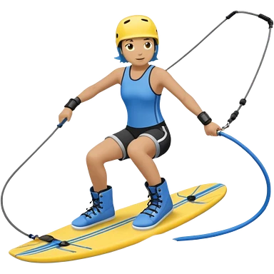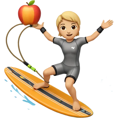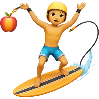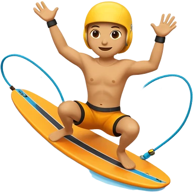 "Apple 3D emoji-style character wakeboarding mid-jump, with arms extended holding an orange rope, legs slightly bent on a yellow board. Stylized water splash behind. Emoji face, rounded body, bright and clean Apple shading." emoji