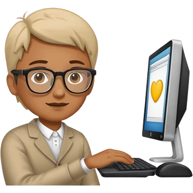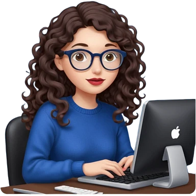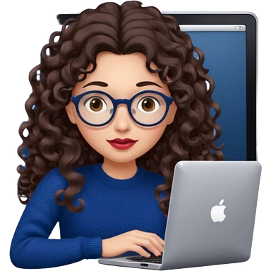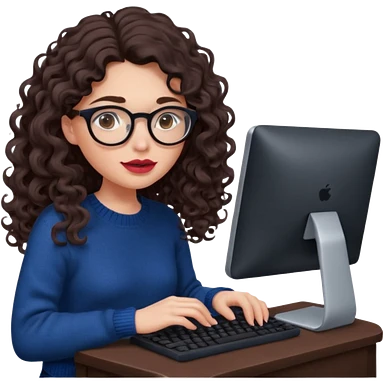 a european white young woman with very long wavy dark brown/chocolate hair with curls at the end of her long hair typing in a computer. she's using round glasses, her lips are light red and her cheeks slightly pink. Her eyes are dark brown. She's using a dark blue knit sweater emoji