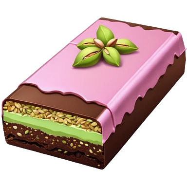 chocolate partially wrapped in elegant pastel pink foil, the top half broken to reveal rich pistachio cream and crispy kataifi strands inside, glossy chocolate surface, detailed texture emoji