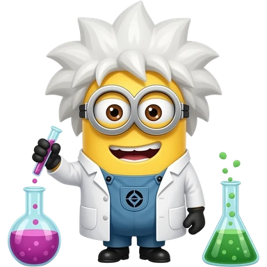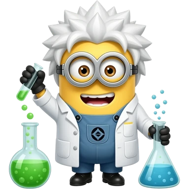 crazy minion in lab coat with wild white hair mixing potions emoji