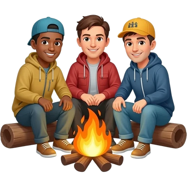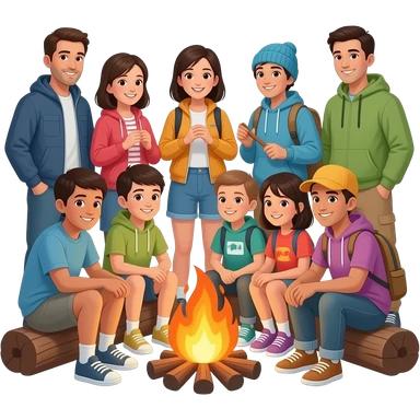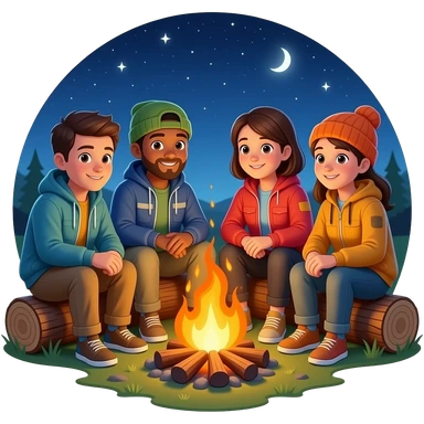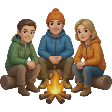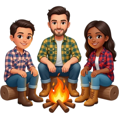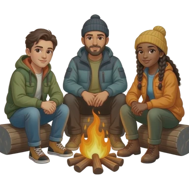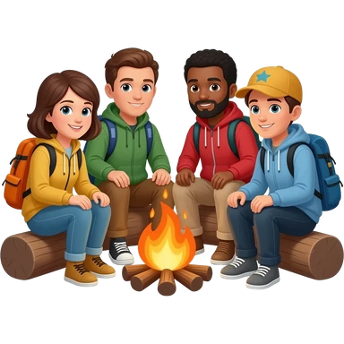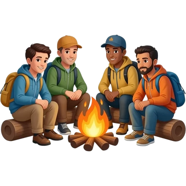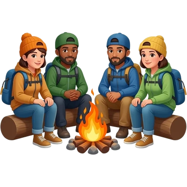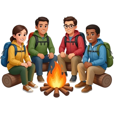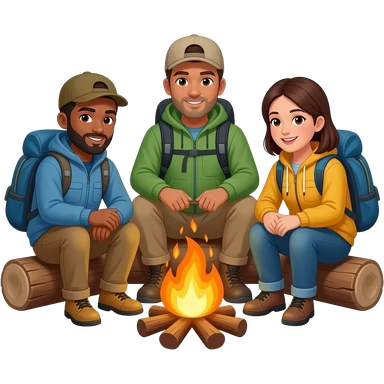 race men and women sitting around a campfire wearing camping clothing no visible backpacks emoji | AI Emoji Generator