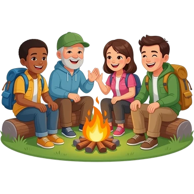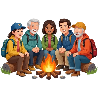 age and race diverse adults sitting around a campfire laughing wearing camping clothing no visible backpacks emoji