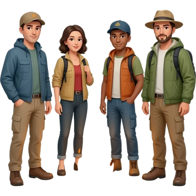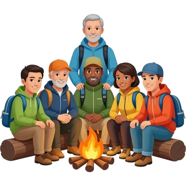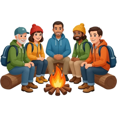 age and race diverse adults sitting around a campfire wearing camping clothing no visible backpacks emoji