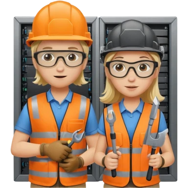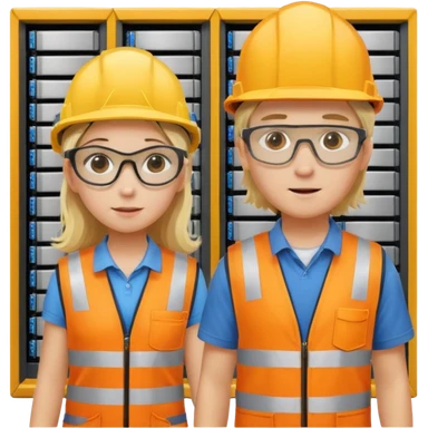 Create a emoji of boy and girl(blond hair) pushing Data center rack servers. They wearing helmet, ear protection, safety glass, orange vest. Holding drill and wrench emoji