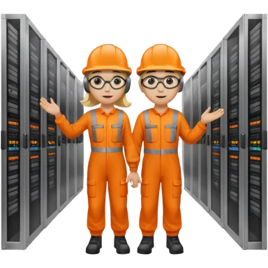 Create a emoji of boy and girl(blond hair) pushing Data center rack servers. They wearing helmet, ear protection, safety glass, orange vest. Yellow drill and wrench on the ground and pockets. Coppers emoji