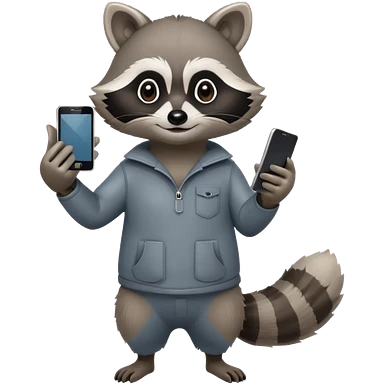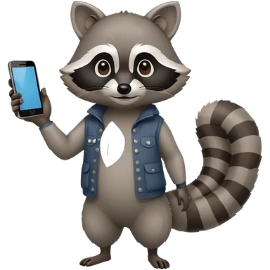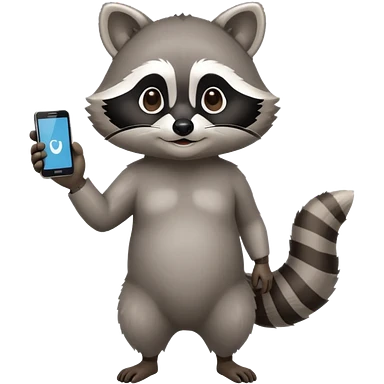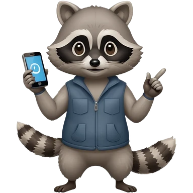 racoon holding a phone and pointing a finger to it full body friendly calm emoji
