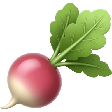 radish, whole, round, pink-red, white root tip, smooth glossy, crisp, green leafy tops, no dirt, no slicing, no extras, soft lighting, emoji scale emoji