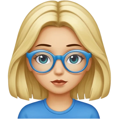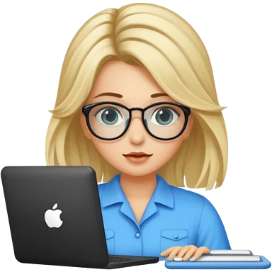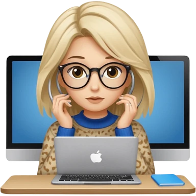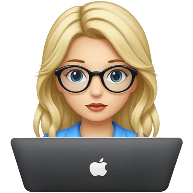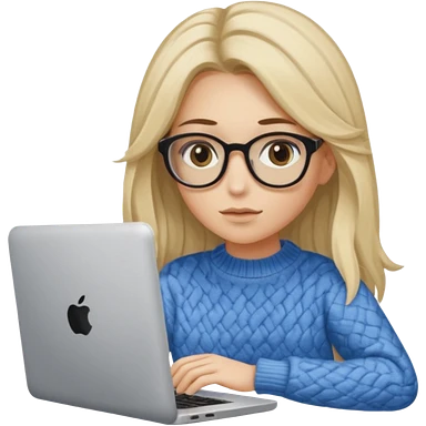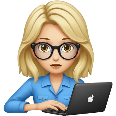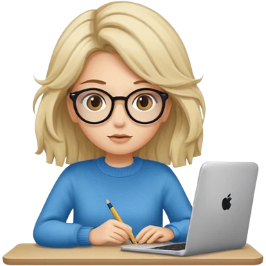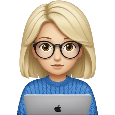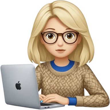 ragazza bionda con capelli molto lunghi, con occhiali tartarugati, occhi azzurri, con maglione beige, seduti alla scrivania che lavora al pc emoji | AI Emoji Generator