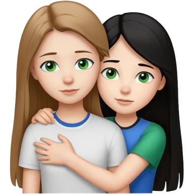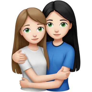 una ragazza dall‘ età di 19 anni con capelli castani chiaro lunghi e lisci , occhi blu , e una ragazza di 17 anni capelli neri occhi verdi che si abbracciano e con una maglia bianca o nera emoji