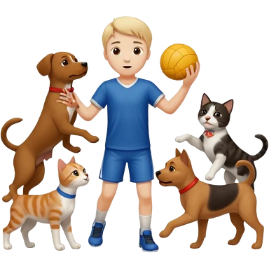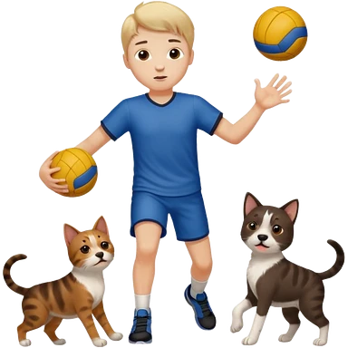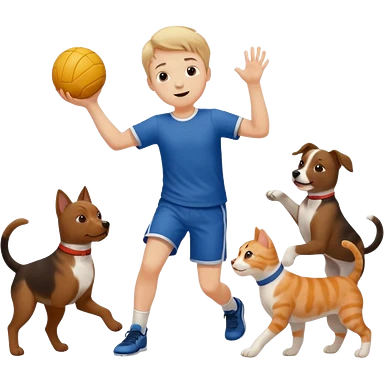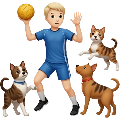 ragazzo basso che gioca a pallamano circondato da cani e gattu emoji