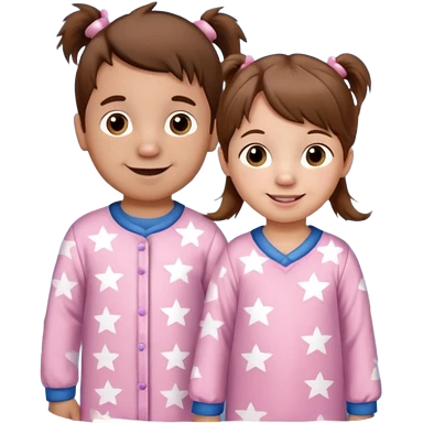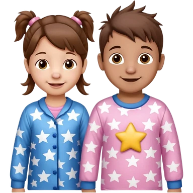 A toddler girl with brown hair with two pig tails, wearing pink pajamas with white stars on them. With a 4 year old boy with spikey brown hair, wearing blue pajamas with white stars on them. Both light skin and smiling. Both with a mix of big and small white stars on the pajamas emoji