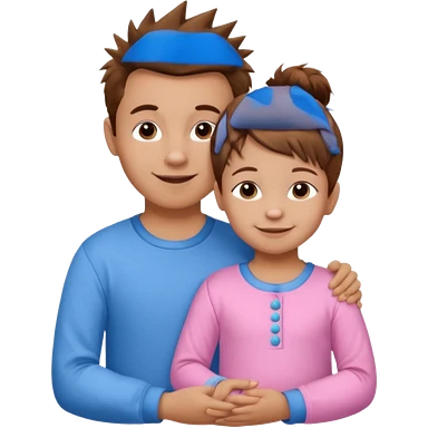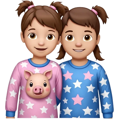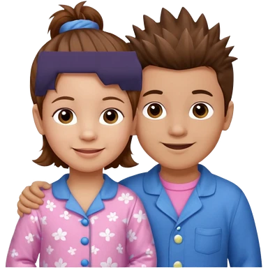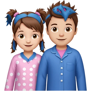A toddler girl with brown hair with two pig tails, wearing pink pajamas and a bigger 4 year old boy with spikey brown hair, wearing blue pajamas. Both light skin and smiling. emoji