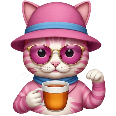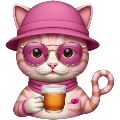 Pink cat with hat, holding cup of tea, wearing sunglasses emoji