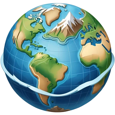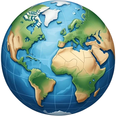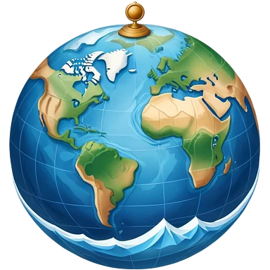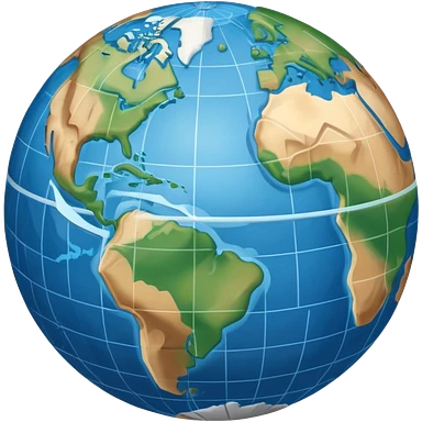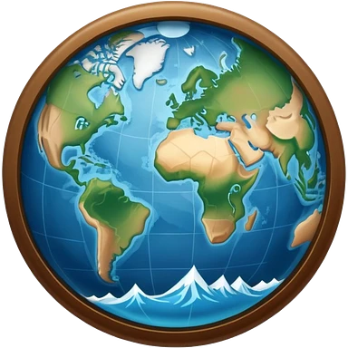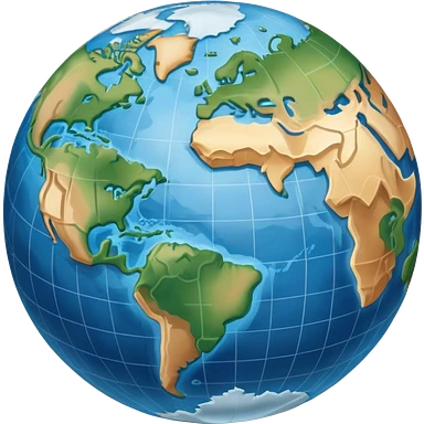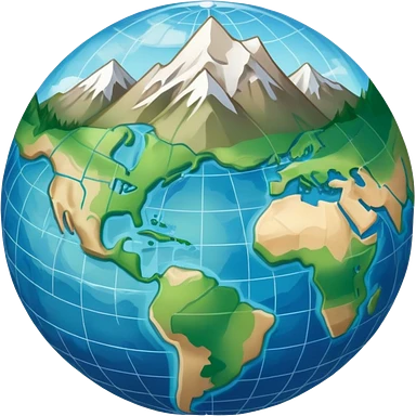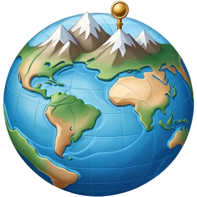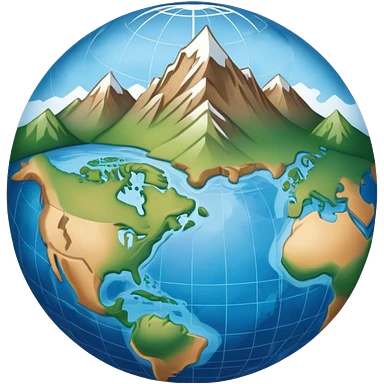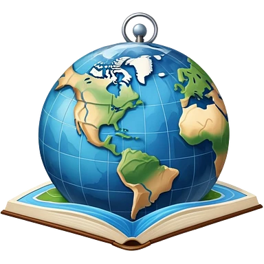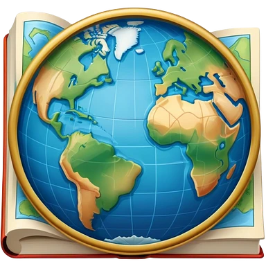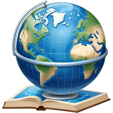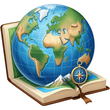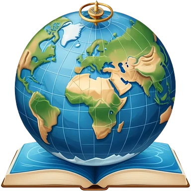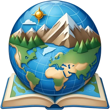 an icon featuring an earth with atitude and longitude lines, a textbook, and a topographic map, symbolizing geography as a science. The design includes a compass, mountain ranges, and rivers, representing the study of Earth's features and landscapes. Transparent background highlights geography. emoji