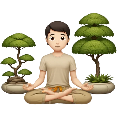 rapaz magro cabelo escuro, camiseta bege e bermuda bege escuro, corpo inteiro meditando num jardim oriental emoji