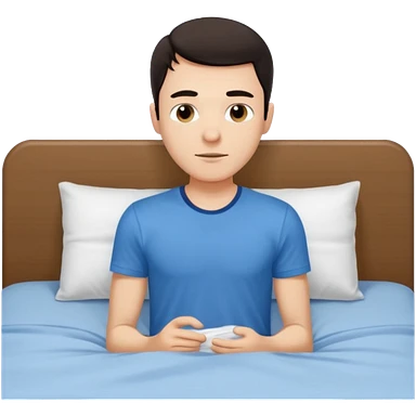 rapaz jovem magro de cabelo escuro, com camiseta azul e cueca branca ao lado de uma cama emoji