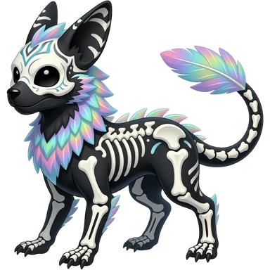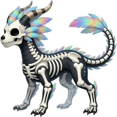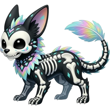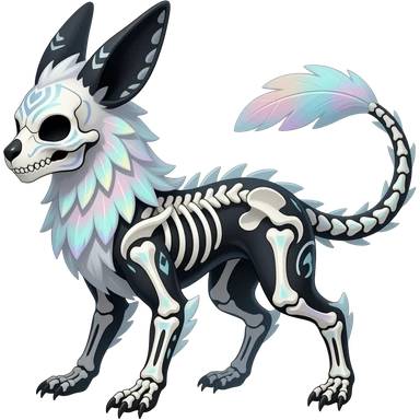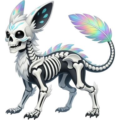 Rare realistic cute pretty elegant skeletal tribal patterned whitish pastel colorful iridescent shiny glossy feathery epic handsome gorgeous aesthetic black-skulled Vernid-Trico-Sergal-Salandit-Nargacuga-species-Fakemon-creature by LiLaiRa, 4 legs, 1 tail, random markings, (full body) long ears emoji