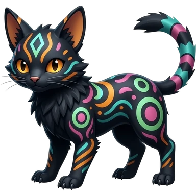 Rare warm-colored exotic edgy epic aesthetic gloomy spooky dark modern colorful cyber-Genet-Trico-Salandit-Civet-species-Fakemon-hybrid-creature, with beautiful intricate markings, full body emoji
