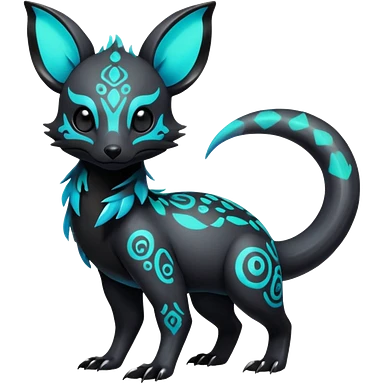 Rare futuristic bioluminescent iridescent neon glowing cute epic aesthetic gothic colorful Salandit-Eevee-Trico-Civet-species-Fakemon-hybrid-creature, with intricate tattoo markings, full body emoji