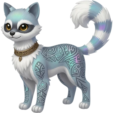 Rar iridescent furry fuzzy silvery exotic cute epic aesthetic gothic colorful Salandit-Eevee-Civet-species-Fakemon-hybrid-creature, with a collar, and with intricate tribal markings, full body emoji