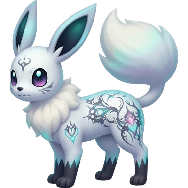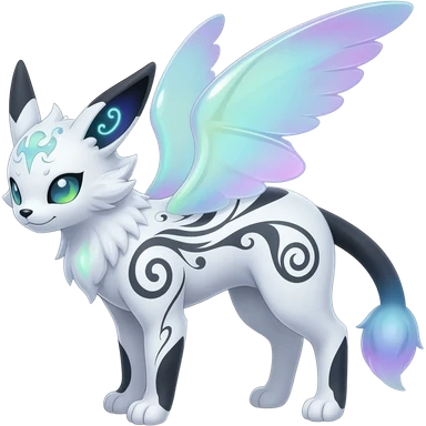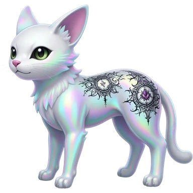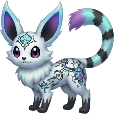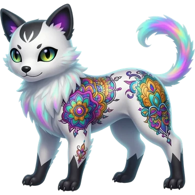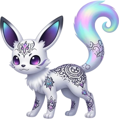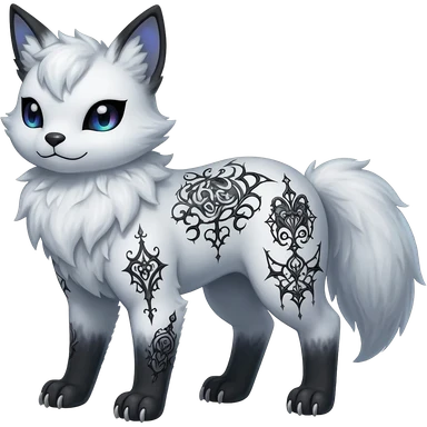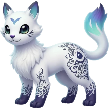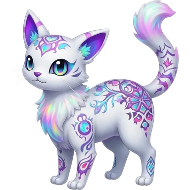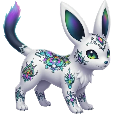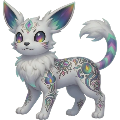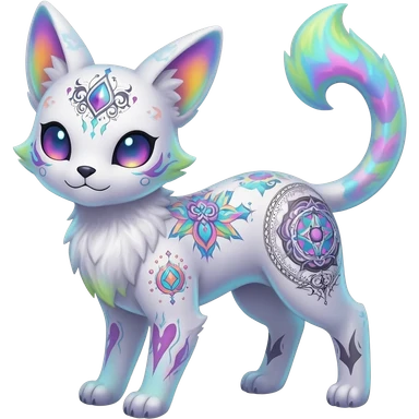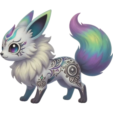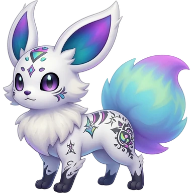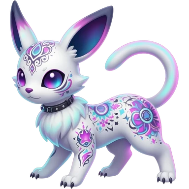 Rare neon iridescent white exotic cute epic aesthetic gothic colorful Salandit-Eevee-Civet-species-Fakemon-hybrid-creature, with intricate tattoo markings, full body emoji