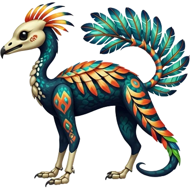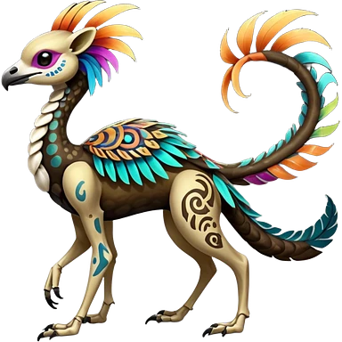 Rare realistic dark edgy glossy shiny tropical tribal patterned feathery skeletal badass epic pretty beautiful handsome gorgeous aesthetic colorful vibrant Vernid-Trico-species-Fakemon-creature by LiLaiRa, 4 legs, 1 tail, random markings, (full body)emoji