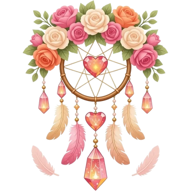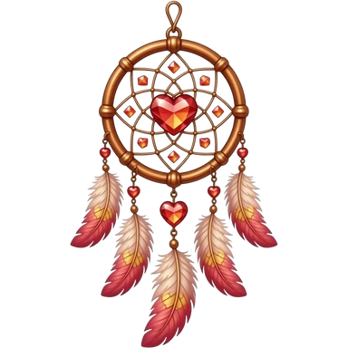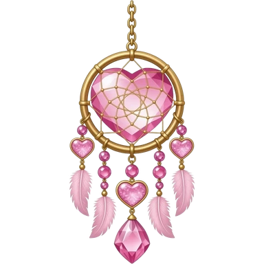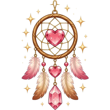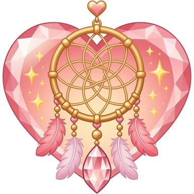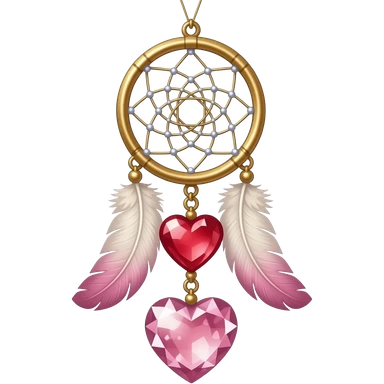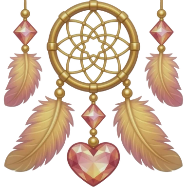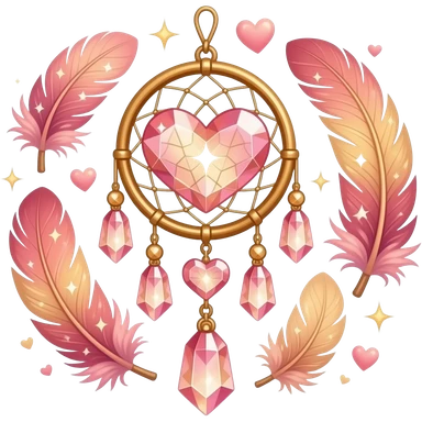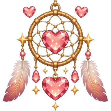 Reddish-pinkish and golden warm-colored romantic lush beautiful pretty hanging crystal-catcher aesthetic with hearts and sparkles and feathers emoji