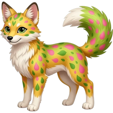 Feral Rare Fantasy vivid tropical mango-lime-pink splash-patterned silky fur Vernid-Sergal-Genet-Trico-species by LiLaiRa, random markings, tufted tail, tufted ears, full body emoji