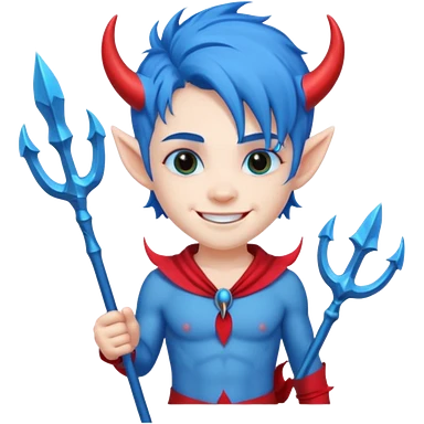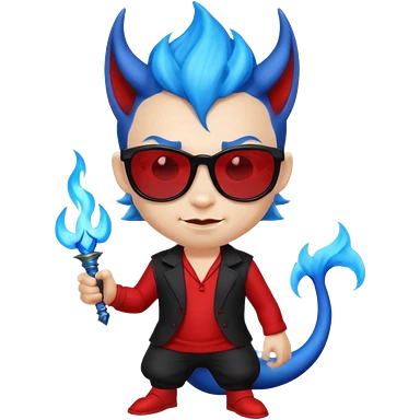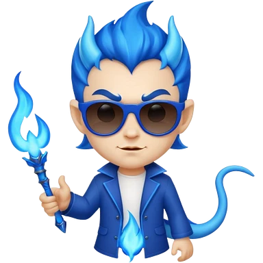 Cool devil with blue flame tail and shades, cute face, half body emoji