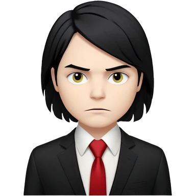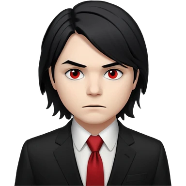 🎨 Classic Emoji — Gerard Way (Revenge Era) Round, simplified emoji style Pale skin tone Jet-black, shoulder-length hair Heavy eyeliner and slight red shadow under the eyes Subtle serious / melancholic expression Hint of red tie visible on black suit Transparent background emoji