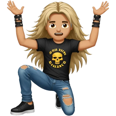 A person headbanging with long hair, wearing a black band t-shirt, making rock hand gesture emoji