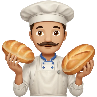 Middle aged male pastry chef - with a mustache, apron, white hat, holding bread emoji