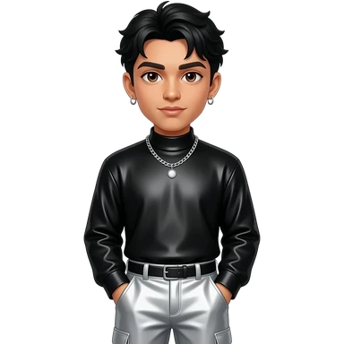 Rauw Alejandro with brown eyes, black hair, black metallic high neck shirt, silver metallic baggy pants, necklace and earrings emoji