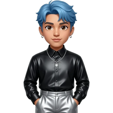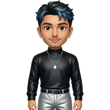 Rauw Alejandro with brown eyes, black hair with periwinkle blue dyed, black metallic high neck shirt, silver metallic baggy pants, necklace and earrings emoji | AI Emoji Generator