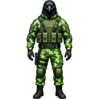 Raven head wearing bright green camouflage tactical gear emoji | AI Emoji Generator