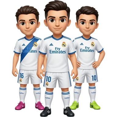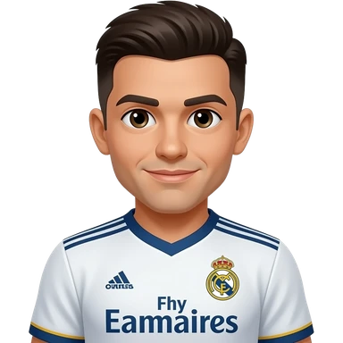 Smiling dark-skin footballer emoji with short black curly high-fade hair, big white-teeth grin, wearing a white Real Madrid jersey with black Adidas shoulder stripes, ‘Emirates Fly Better’ text on chest, small gold badge and Adidas logo.” emoji