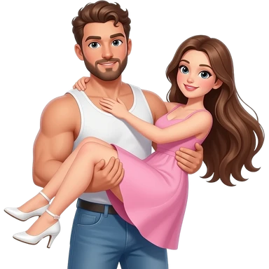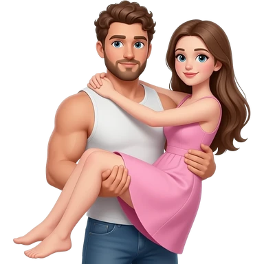 Realistic white skin brown short curly hair with beard muscular man carrying white skin long straight brown hair girlfriend wearing aesthetic dress HD emoji
